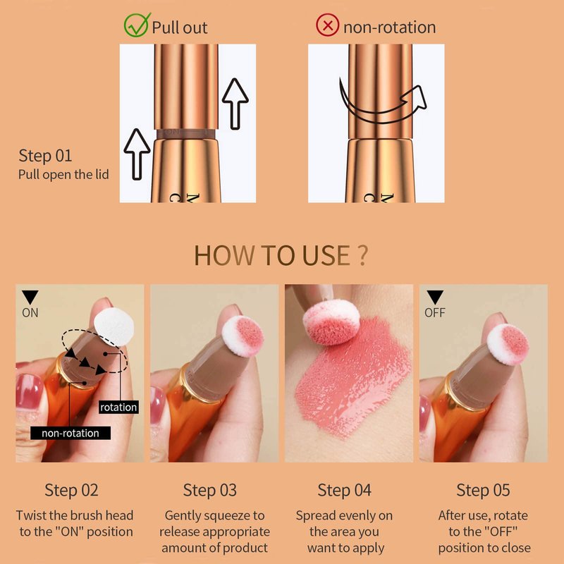 - Easy to Use with Cushion Applicator --- 1.Open the lid(do not twist it ) 2.then twist it to " on " according to the direction on the nozzle 3.press the squeeze tube slightly,the paste cream will appears on the applicator,then twist it to " off " 4.Put 2 or 3 tiny dots and blended it out with your fingers.Remember to close the lid after use.NOTICE:Every beauty wand has a sponge dabber,make sure do not twist it before open the lid,or the sponge tip applicator will attached to the lid