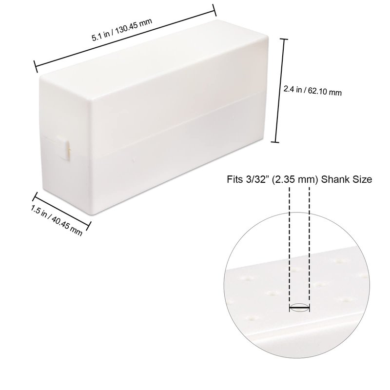 - Quantity: 1 piece | Color: White | Hole fit: 3/32” Shank Carbide Bit | Measurement: Length: 2.4 in. | Width: 2.4 x 1.2 in. | Design: Rectangle Nail Drill Bit Holder
