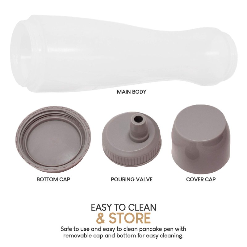 - Easy to clean and store; Safe to use and easy to clean pancake pen with removable cap and bottom for easy cleaning; Dishwasher Safe; Comes with a cap that works as a rest or snaps into place for easy storage