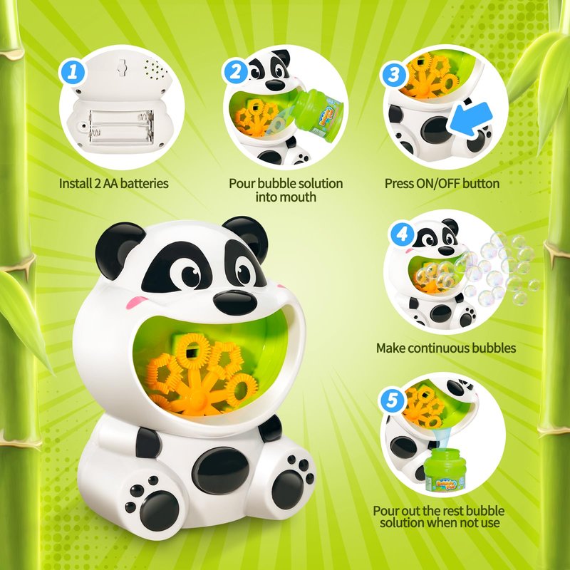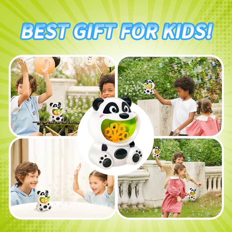 - 【Cute Panda Magic】Panda Bubble machine isn't just a bubble machine; it's a bundle of joy wrapped in a charming panda design. Watch your kids light up as they play with this delightful toy, which also features clever safety measures. The rotating bubble wands automatically stop when touched, ensuring little fingers stay safe while having fun. This adorable panda guarantees endless giggles and complete peace of mind for parents.