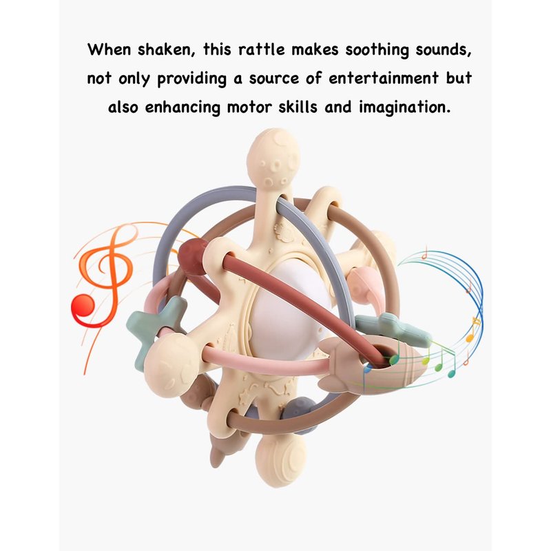 - 【Rattle & Sensory Teether Toy 】When shaken, this rattle makes soothing sounds, not only providing a source of entertainment but also enhancing motor skills and imagination.The soft yet durable silicone teether is your baby’s newest best buddy, staying by their side through every chomp and chew. It is easy for little hands to hold and are also ergonomically designed to access all teething areas.