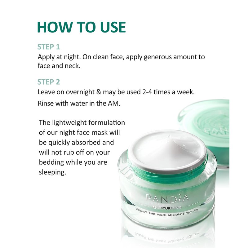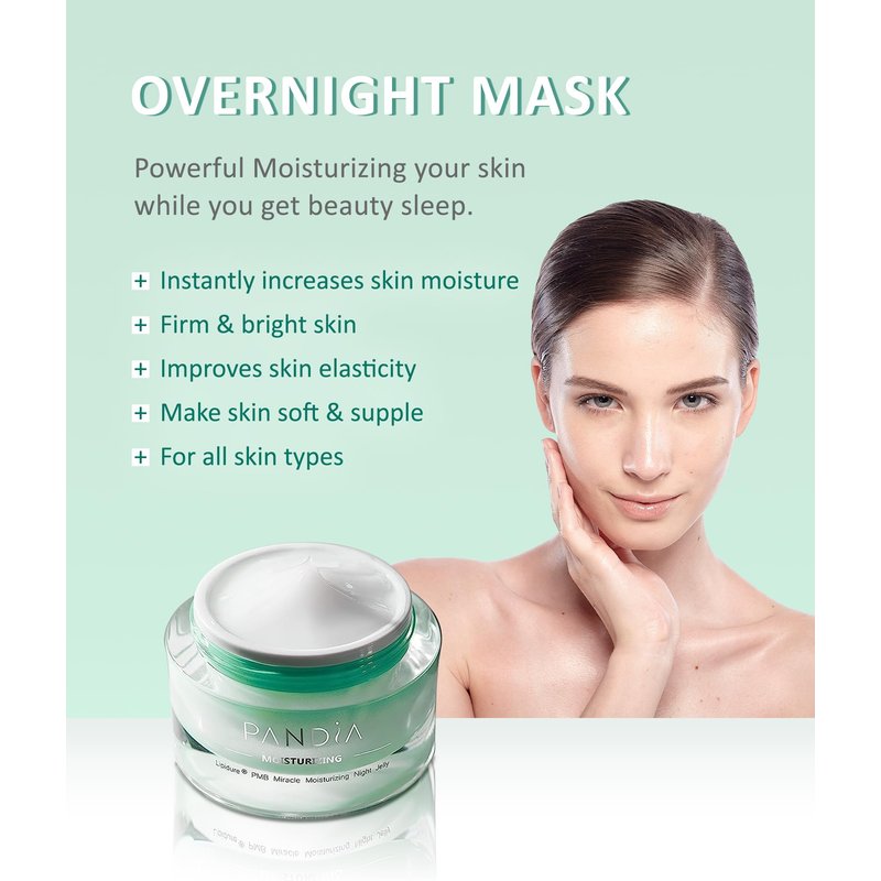 Pandia firming Overnight Gel Face Mask knowing this hydrating face mask works all hours to plump your skin with moisture and visibly firm your look. It’s specially formulated with a Lipidure moisturizing polymer that helps skin’s ability to retain moisture. Also, Hyaluronic Acid improves skin’s moisture barrier and regenerates surface skin and work for 24 hours to visibly firm and smooth. Feel free apply this mask every night (no rinse required) and you’ll wake up to firm, hydrated looking skin every day! About Pandia Overnight Gel Mask Wake up to a radiant complexion with this overnight mask. Formulated with Hyaluronic acid and Rosa Damascena flower Water, Pandia Overnight Gel Mask melts into skin and renew skin cells. Helps to reduce the appearance of dark spots and stubborn discoloration while you sleep for a smoother and more even-toned complexion in the morning. Why It’s Special Hyaluronic acid moisturizes the surface of the skin, leaving it smooth and soft Rose Damascena has mild astringent properties and can be used as a toner for oily skin. Includes Lipidure Moisturizing Polymer that demonstrates water resistance, improves moisturization, and reduces skin roughness. It may protect from commonly used irritants. How to Use Apply a thin layer to skin in the evening after cleansing and toning. Leave on overnight and rinse in the morning. Other Details Size: 1.7 oz / 50 ml Free of Parabens, Phthalates, and Synthetic colors and Fragrances.