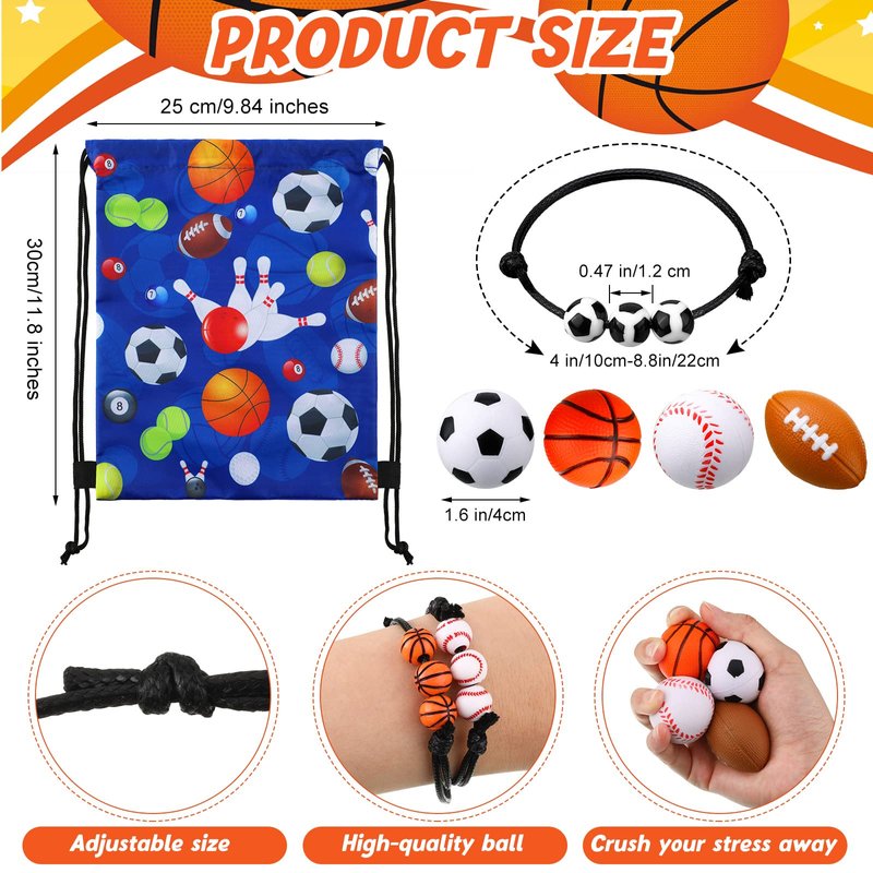 - Suitable Size: the sports bracelet is an adjustable design, the diameter of the ball stress ball is about 1.2 inches, suitable for small hands to play, the ball drawstring bag is about 30 cm/ 11.8 inches in length, 25 cm/ 9.84 inches in width, designed with a drawstring airtight, provide you enough space to store party supplies or daily necessities, such as balls, snacks, books, and so on