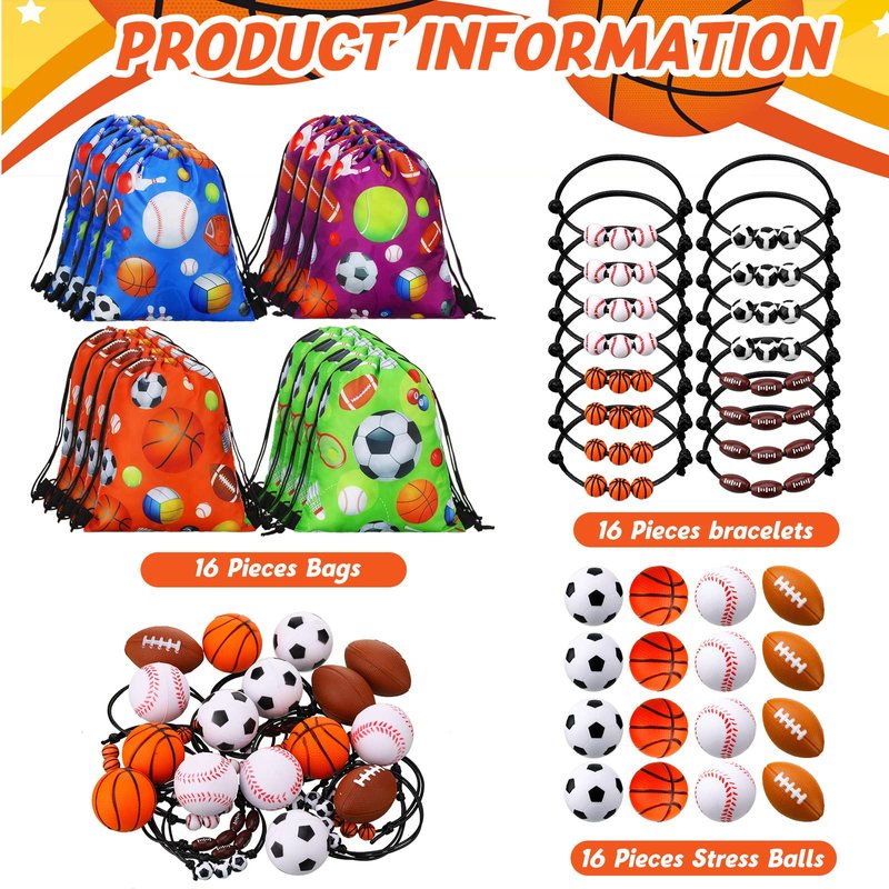 - Package Includes: you will receive 16 pcs balls drawstring bags, 16 pcs sports themed charm bracelets, and 16 pcs sports stress balls, this ideal combination can meet your sports themed party needs, very suitable for teenagers and even adults