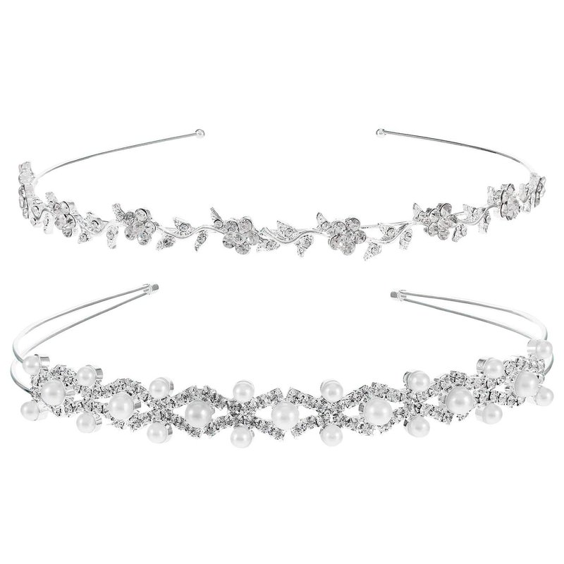 Pangda 2 Pieces Rhinestone Bridal Crystal Women's Headband Wedding Flower Girl Pearl Diamond Slim Thin Silver Flower Leaves Crown Hair Band Accessories Headpiece Tiara for Bride Bridesmaids