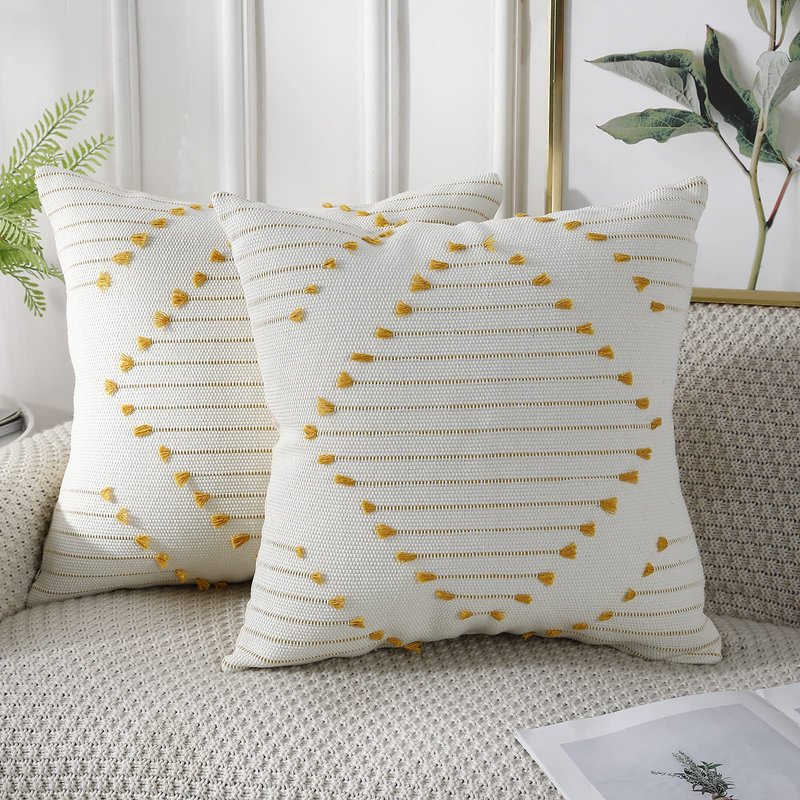 PANOD Set of 2 Boho Tufted Throw Pillow Covers with Tassel 18x18 inch, Decorative Indoor Outdoor Bohemian Square Cushion case Pillowcase for Couch Sofa Livingroom car Farmhouse Yellow and Cream White