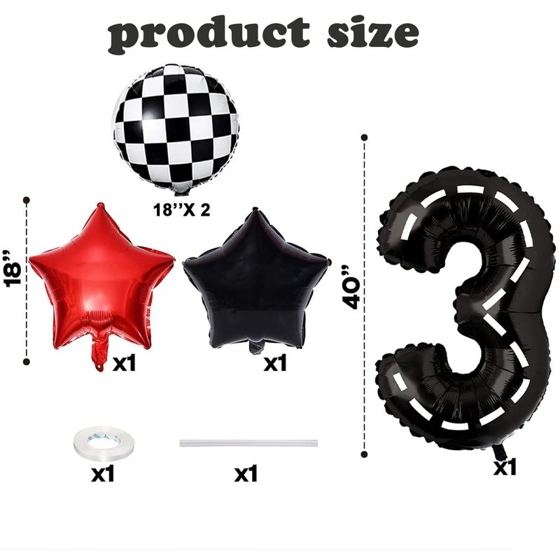 - 【Package/Size】 1 pcs 40 inch racecar number balloon ,1 Pcs racing Banner,2 pcs black and white chequered balloon 18 inch,2 pcs star balloon 18 inch