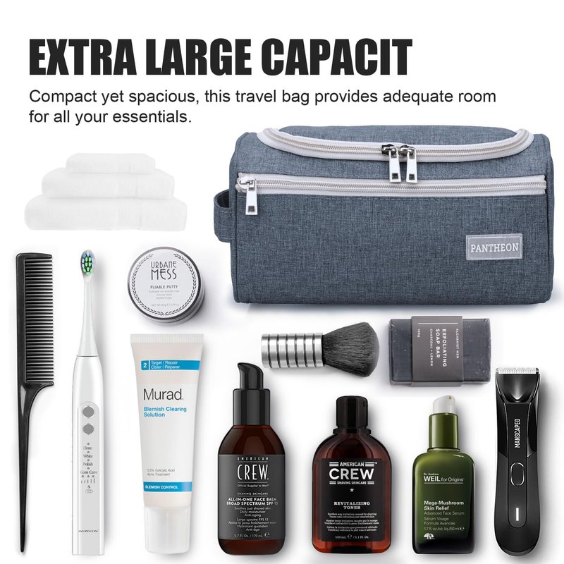 - HIGH-QUALITY DURABLE MATERIAL: This exceptional toiletry travel bag by Pantheon is made of attractive Cationic Oxford cloth, which is known for its lightweight yet durable qualities, the perfect combination for traveling. This specific material is water resistant, making it safe for use in environments where it may become wet, such as a bathroom or shower area. The interior of the bag is securely lined with a special material that can handle accidental toiletry spills and can be easily cleaned t