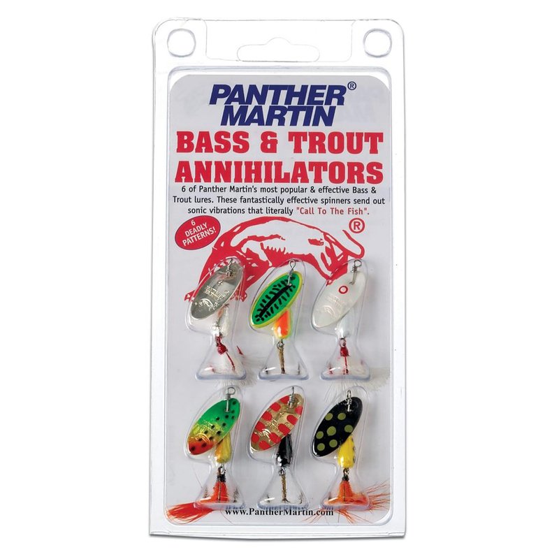 - ✅ PANTHER MARTIN Bass & Trout Annihilators: This Bass & Trout Annihilators Kit contains 6 of our deadliest bass and trout lures, our popular Panther Martin spinners, specially selected by pro anglers to catch fish in the U.S. waters all-year round. Unique convex/concave blade mounted directly on shaf.