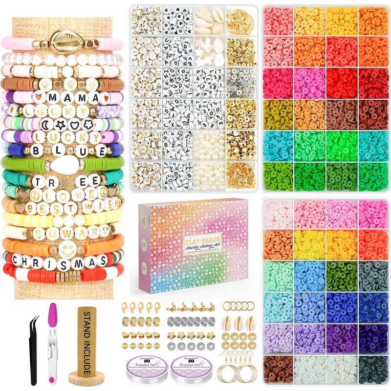 Looking for the perfect beads for your DIY bracelet making project? Look no further than this incredible set of clay beads, featuring 14,000 pieces in a whopping 48 different colors and 1500+ accessories! With this array of colors to choose from, you can create bracelets that match any outfit or style. Crafted from durable and lightweight clay, these beads are the perfect choice for handmade jewelry. Their smooth surfaces make them comfortable to wear, while their vibrant colors ensure that your bracelets will stand out from the crowd. These clay beads come in a convenient plastic storage box, making it easy to organize and access your supplies. The box is compact and portable, so you can take it with you wherever you go to work on your bracelet-making projects. This set of clay beads is perfect for beginners and experienced jewelry makers alike. They are easy to work with and can be used to create a variety of styles and designs. Whether you are making bracelets for yourself or as gifts for friends and family, these beads are sure to impress. Features: -14,000 clay beads in 48 colors- Durable and lightweight- Smooth surface for comfortable wear- Convenient plastic storage box- Easy to use for beginners and experienced jewelry makers. So if you are looking for high-quality, versatile beads for your bracelet-making projects, look no further than this set of clay beads. With a wide range of colors and a durable design, they are the perfect choice for any jewelry-making enthusiast. Exclusive offering with 1500+ accessories! Make your Jewelry Making kit special; 500 letter beads, from a to z, 100pcs number beads, give your gifts exclusive meaning; Ear wires and ear hoops are provided, now you can make earrings Considering that you might get it as a gift, we packed it in a cute cardboard box; Not only enjoy the joyful DIY time, but also create the most perfect jewelry. Perfect for age 6+ kids, teens, or even adults to make jewelry.