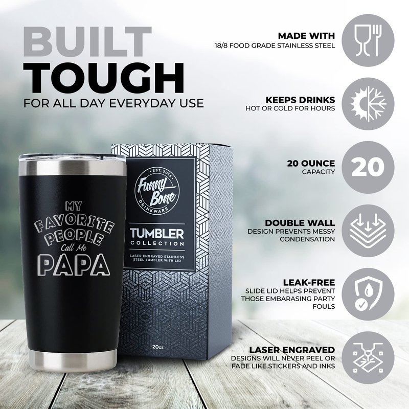 - EVERYTHING YOU NEED, NOTHING YOU DON'T - Purchasing from Funny Bone Drinkware means that you can rest assured that you're ordering an item that's holiday ready! Our papa mug tumblers include a splash-proof slide lid and are safely packaged in a attractively designed gift box!