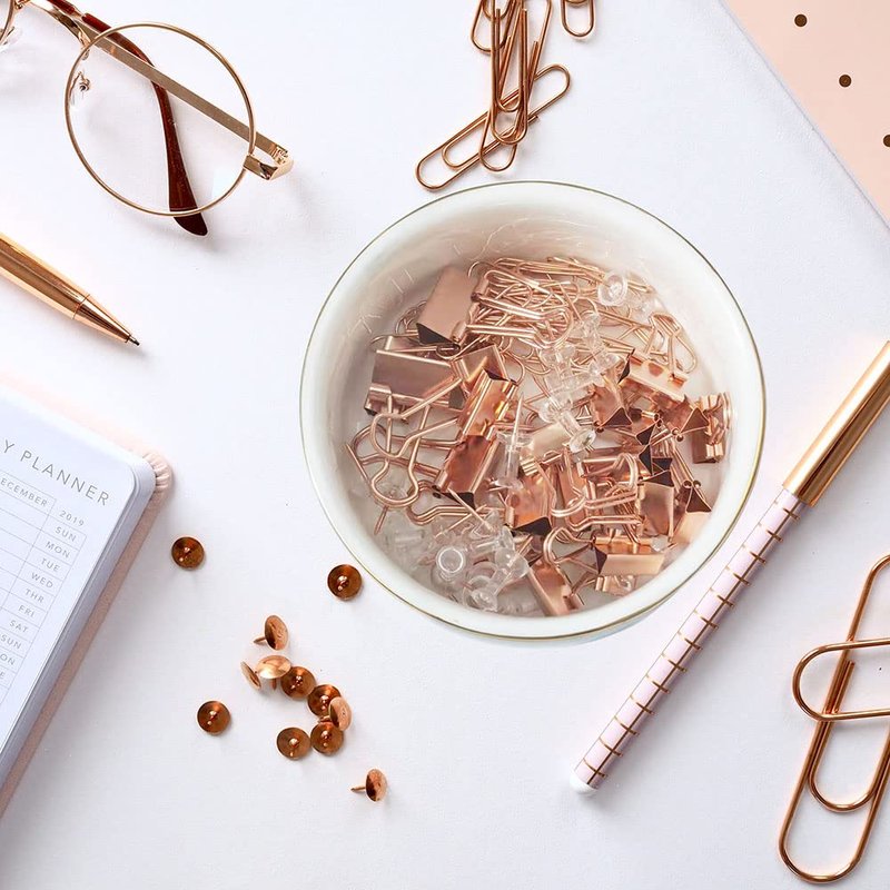 - Simple and Classic Paperclip Holders for Desk—— Round paper clip organizer with gold trim