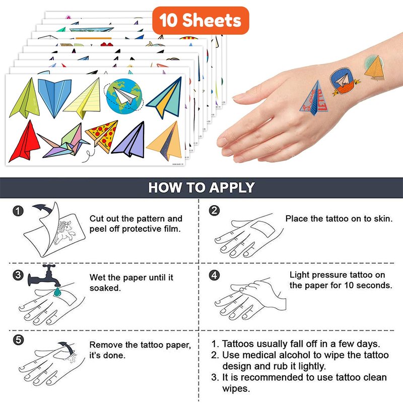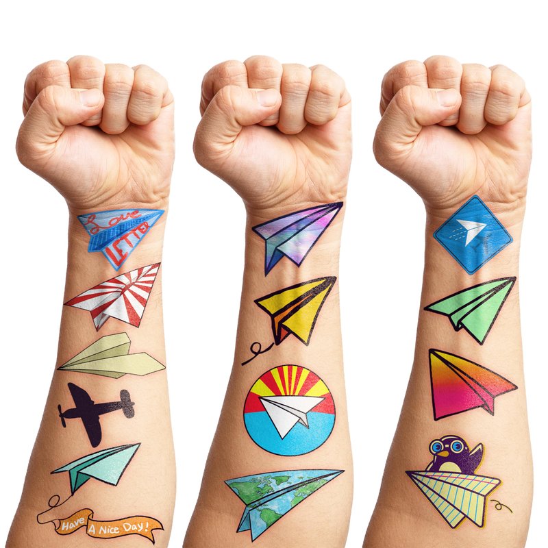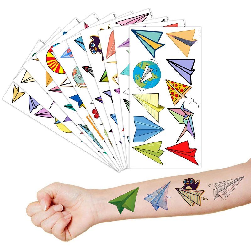 - The set of Cute Paper plane temporary tattoos are made of high quality safety and green paper, and totally safe for your kid's skin. Simply wet the tattoo with water and stick transferred them onto your body, hands, faces and arm you like, Tattoos will last 3-5 days, it also can be easily removed with baby oil, makeup remover or rubbing alcohol.