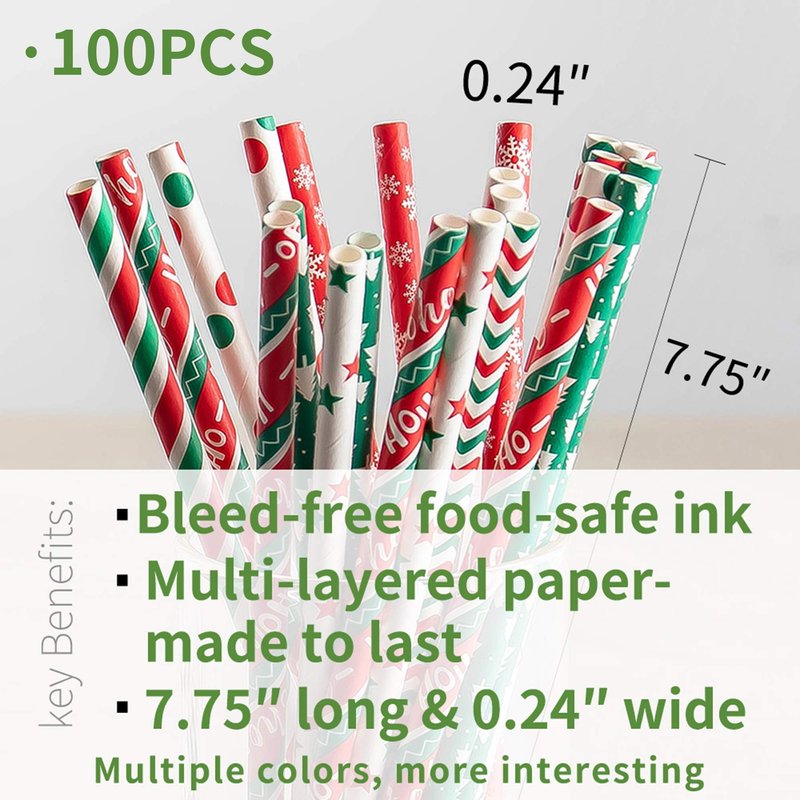 - COLORFUL & PLAYFUL STRAWS:Includes 100 pcs Christmas paper straws, 7 designs.