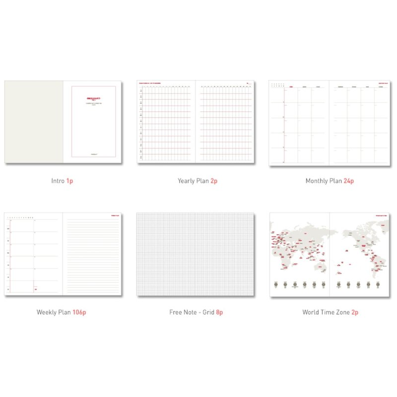 - Contents : Intro - 1 Page, Yearly Schedule - 2 Page / Monthly Plan for 12 months - 24 Page / Weekly Plan for 53 weeks - 106 Page / Free page(Grid) - 8 Page / World Time Zone - 2 Page / Personal Data - 1 Page