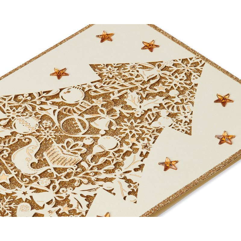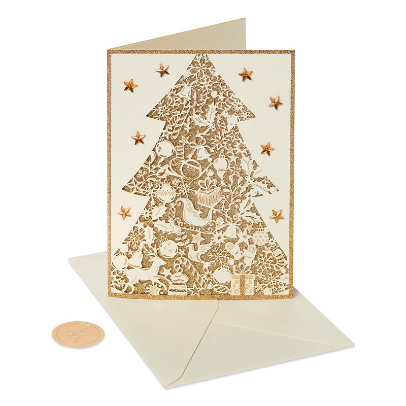 - Papyrus Holiday boxed cards feature an ornate tree with laser-cut paper, glitter, foil and gems, packaged with lined envelopes and gold seals in a red box. Perfect for sending Christmas cards to friends, family or anyone this holiday season.