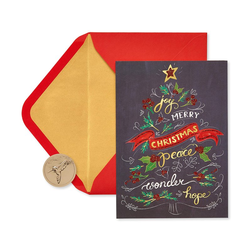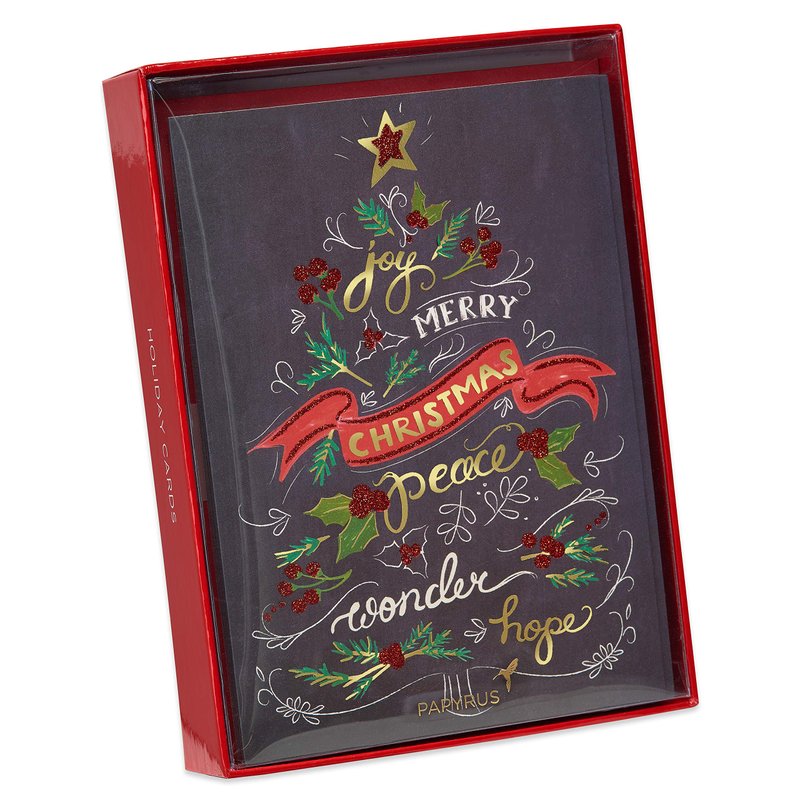 - These elegant Christmas cards by Papyrus features a chalkboard-style look with words and botanicals forming a Christmas tree embellished with red glitter and gold foil. Perfect for sending Christmas cards to friends, family or anyone this holiday season.
