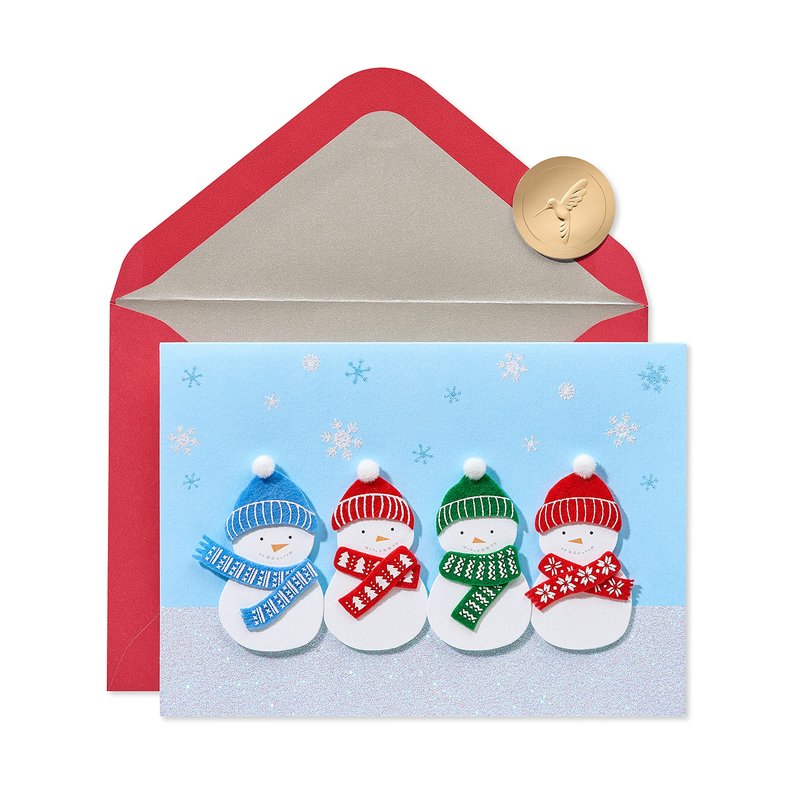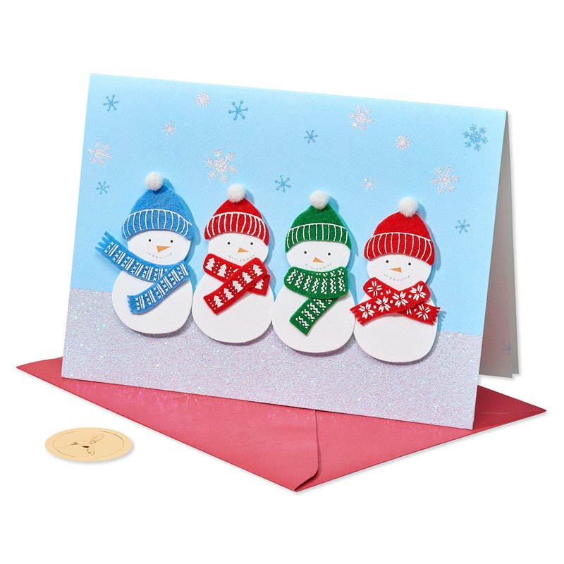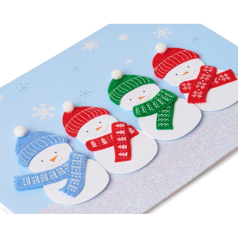 - These festive Christmas cards by Papyrus features playful snowmen with paper attachments, felt, pom-poms, and glitter