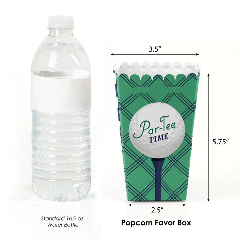 - Par-Tee Time - Golf party favor popcorn treat boxes SIZE 5.75 inches tall x 3.5 inches square at the top. The unique design and large size makes these 12 golf popcorn boxes a must-have for any retirement or birthday party.