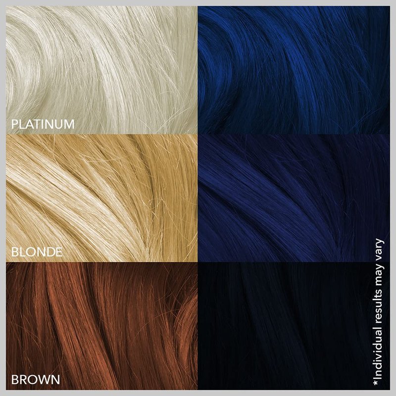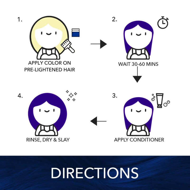 This Navy is a deep midnight blue that fades into a chic smoky blue-grey shade. For it to show up perfectly in its true shade, your hair must be pre-lightened to level 9 or higher. Below that, your hair would go back to being black upon application.