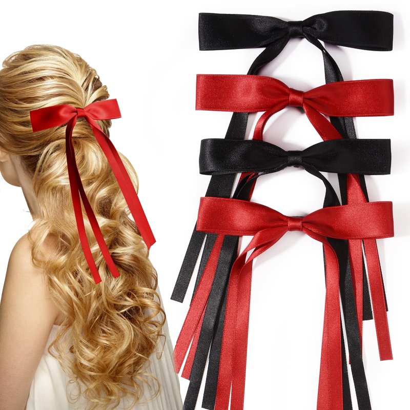 Parcce 4 PCS Tassel Ribbon Bowknot Hair Clips With Long Tail for Women Girl Teens Kids, Solid Holder Fashion Bow Bowknot Hair Accessories Headwear Barrettes Claw(Black&Red)