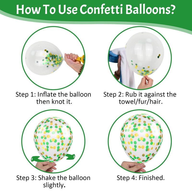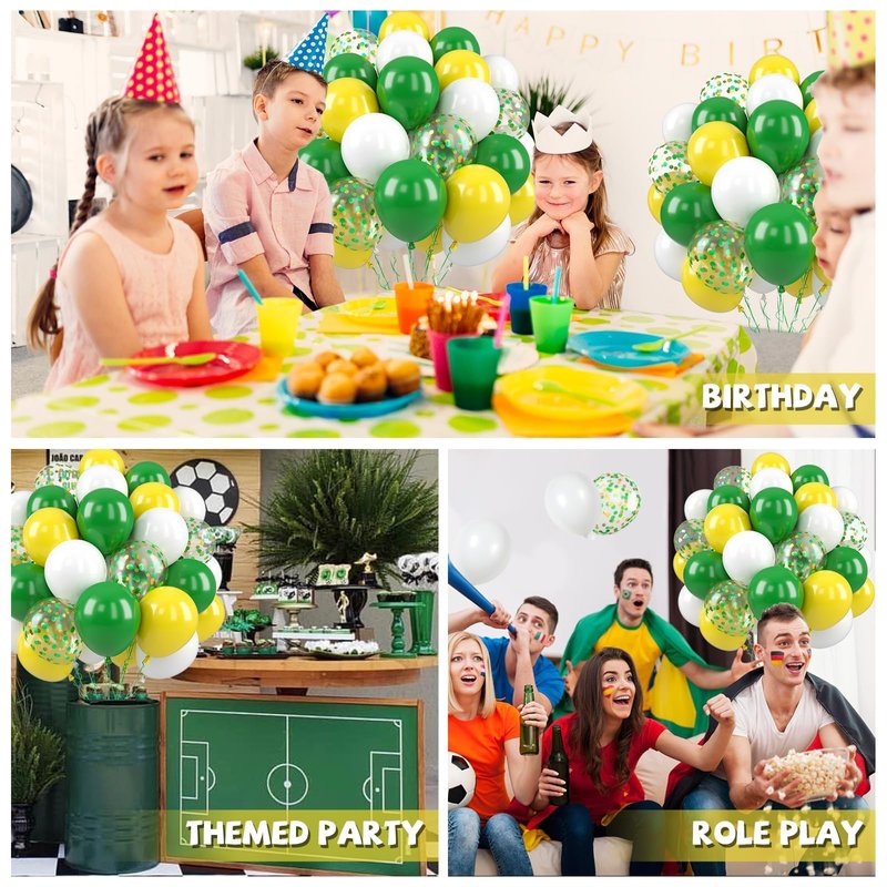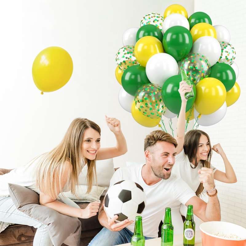 - What You Get - The green and yellow balloons include 50 balloons, 4 distinct colors: dark green balloons x 15, white balloons x 15, yellow balloons x 15, confetti green-gold balloons x 5. Accompanying by a 10m ribbon. These striking and captivating hues will beautifully enhance your memorable and enjoyable moments!