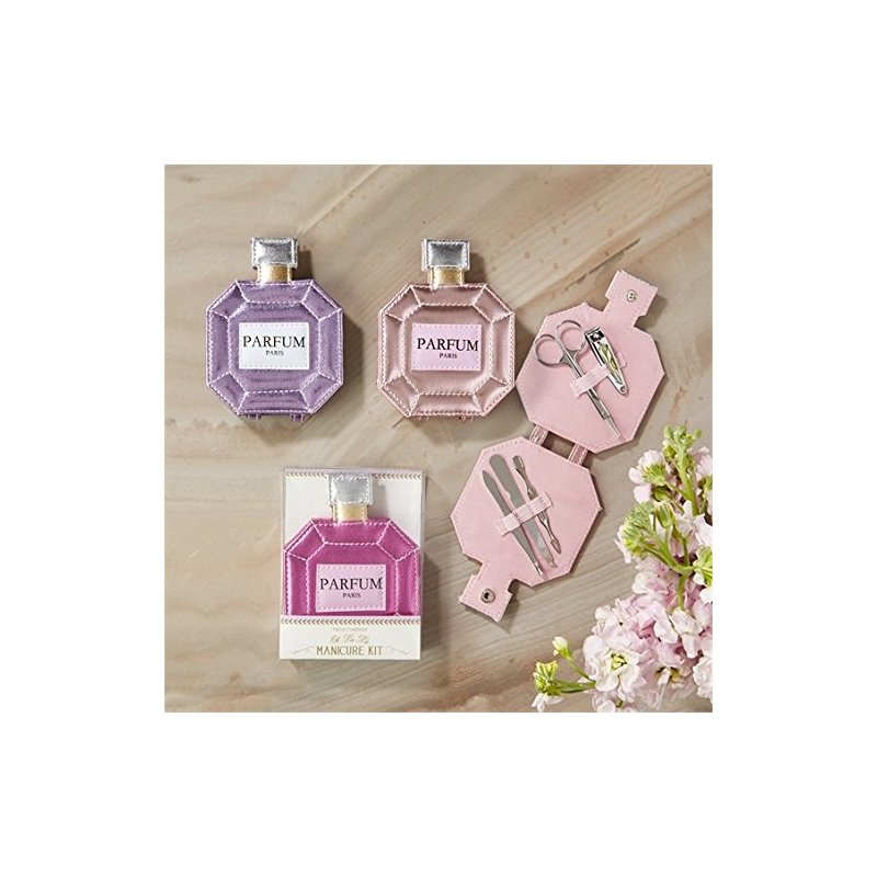 Parfum Bottle Manicure Kit in Gift Box Includes: Tweezers, Scissors, Nail File, Cuticle Tool, Nail Clipper Assorted 3 Metallic Colors: Pink, Lavender, Fuschia - Vegan Leather/Stainless Steel