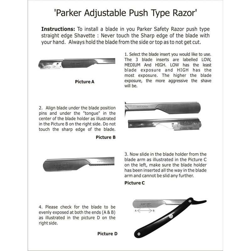 Parker's Barber Razors are used in barbershops and shave parlors worldwide. This razor has an "insert" which you load the blade into. You then slide the insert back into the blade arm with the blade. Unlike most competitors, our razor has a stainless steel blade arm and handle with an elegant black finish - not lower quality aluminum. Just pick your favorite double edge blade, snap it in half, put it in the razor and you're off -- No sharpening or honing required! We recommend our Parker Premium Platinum Half Blades, or we also sell a variety of professional quality pre-cut barber blades. Parker's PTABK Stainless Steel Adjustable barber razor allows you to easily customize your shave. Choose an insert with low, medium or high blade exposure, depending upon your specific task, skill level, skin type or beard growth. It's like having three different razors in one!