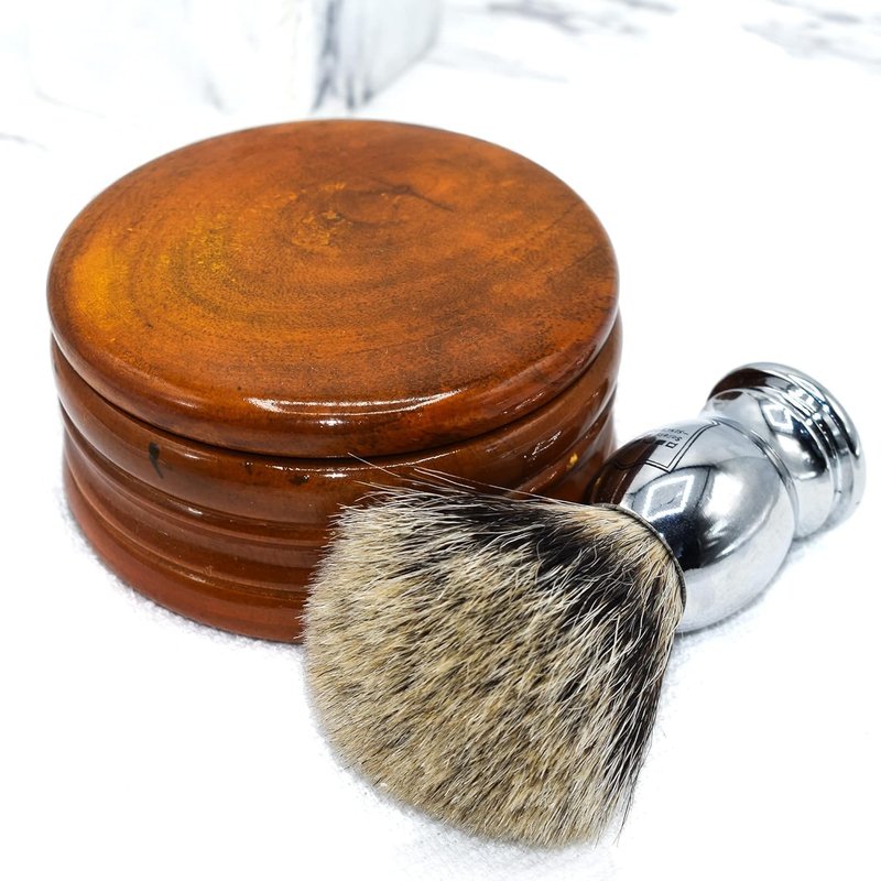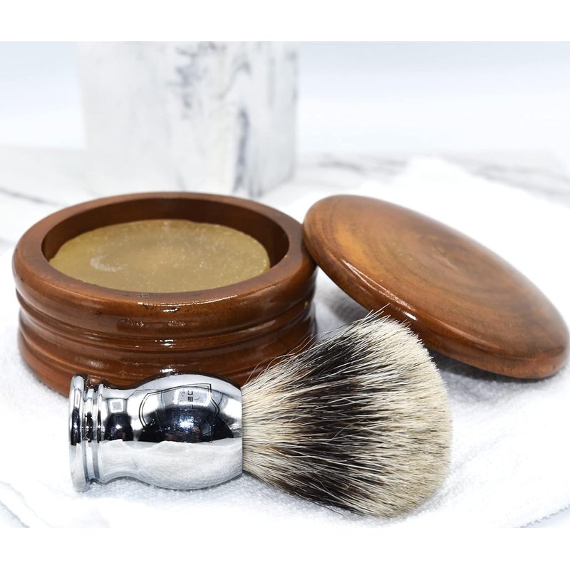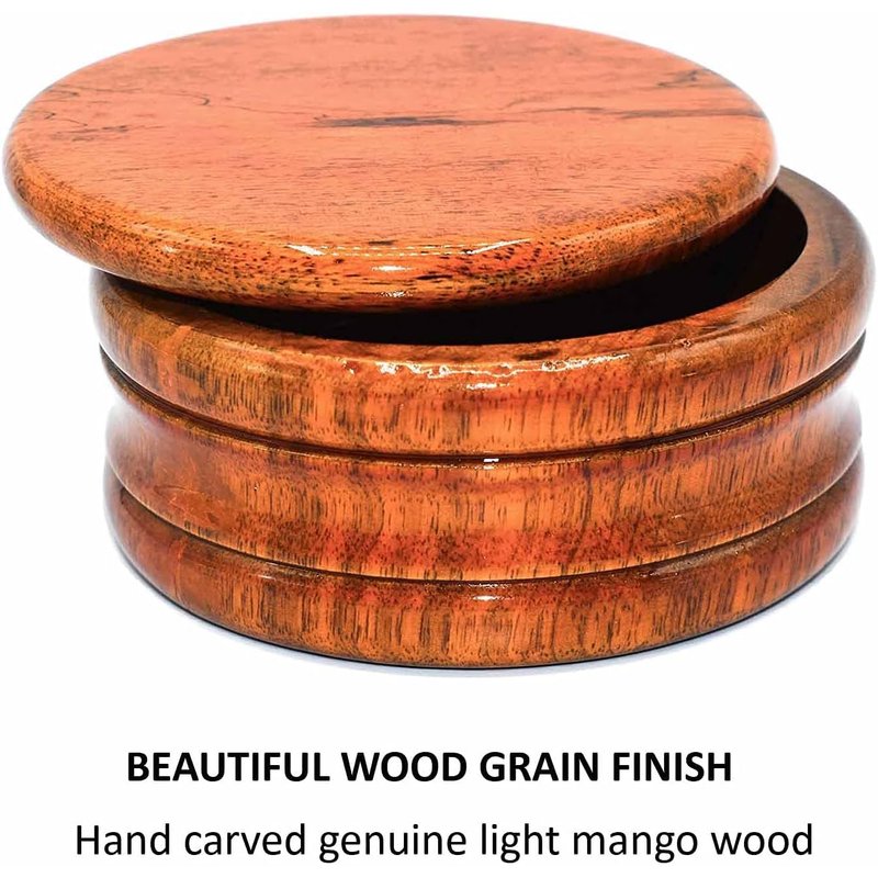 Parker Safety Razor's Shaving Soap Bowl is hand made from Genuine Mango Wood. This particular model has a honey color and extraordinary grain. Mango wood is a renewable resource and comes from the same tree that bears the popular fruit. Mango wood can take a beating and retain its beauty. The exterior dimensions of the closed bowl are approximately 3.75 inches wide and 1.8 inches deep. The interior dimensions are approximately 3.2 inches wide and 1.00 inch deep.
