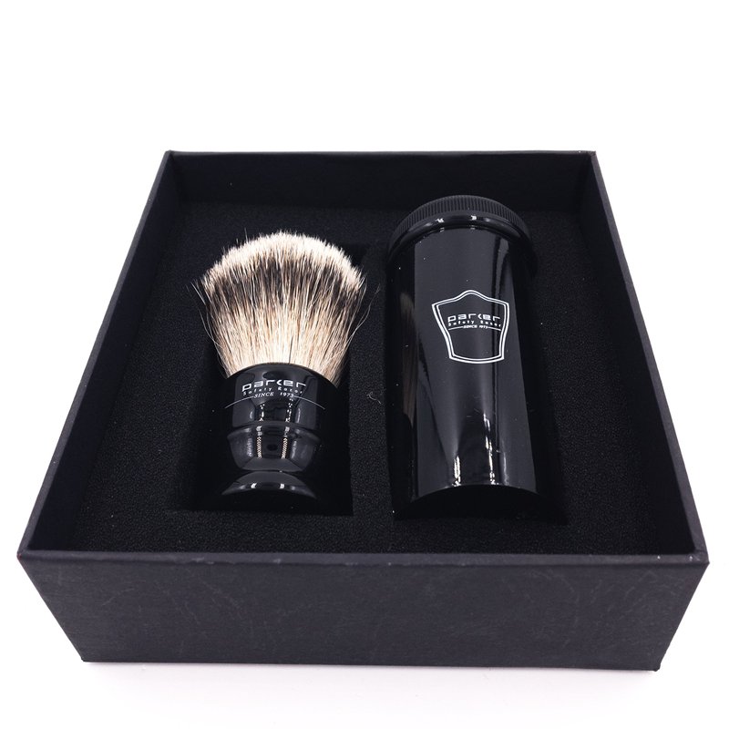 - A travel brush with a 18 mm handmade Silvertip badger brush knot