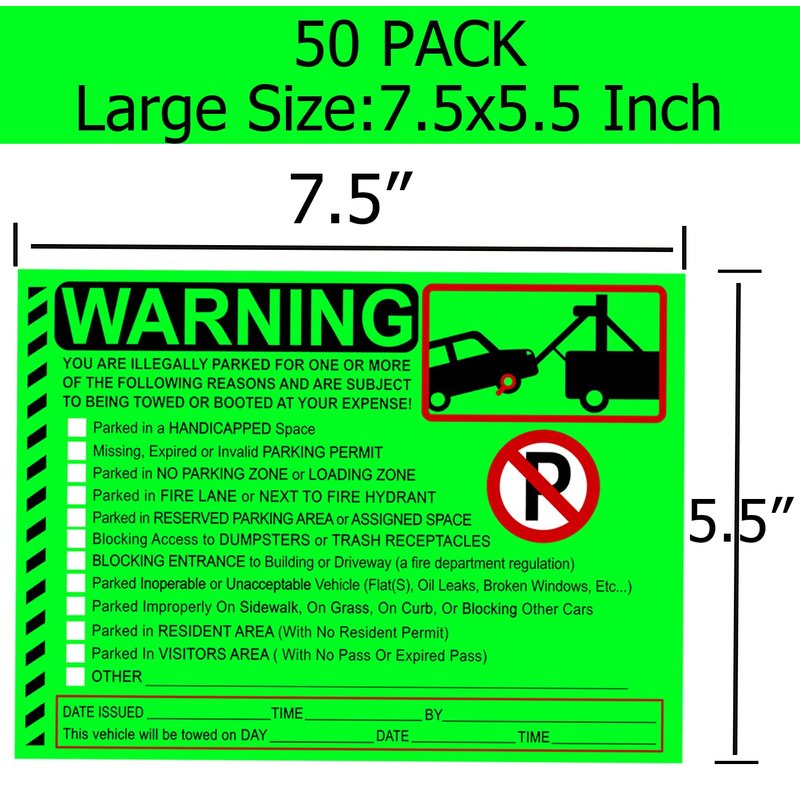 Parking Violation Stickers Notice Parking Violation Stickers Tow Warning You are Illegally Parked Multi Reasons 50 pcs Private Parking Warning Sticker for Car Window Fluorescent Green 5.5X7.5 inch