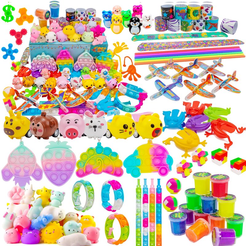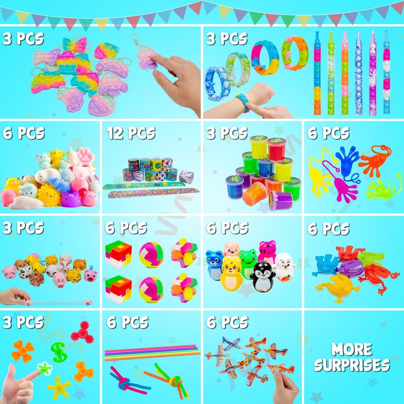 - Party Favors Bundle Include 75 PCS, Include Pop Fidget Toys, Squeeze Animal, Maze Puzzles, Puzzle Toys, Slap Bracelets, Novelty Gyro Fingers Toys, Sticky Hands, Pull Back Cars, Slime Etc.