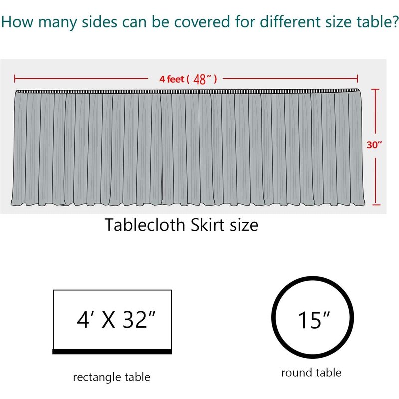 - Width of the Skirt: 30” high. There are 5 size could be chosen. L 3(ft)*H 30in, L 4(ft)*H 30in L 6(ft)*H 30in, L 9(ft)*H 30in, L14(ft)*H 30in. The difference is the different length. Please choose the size according to your table size and how many sides you want to cover the table.