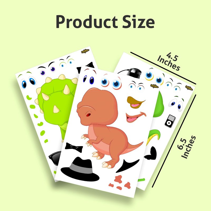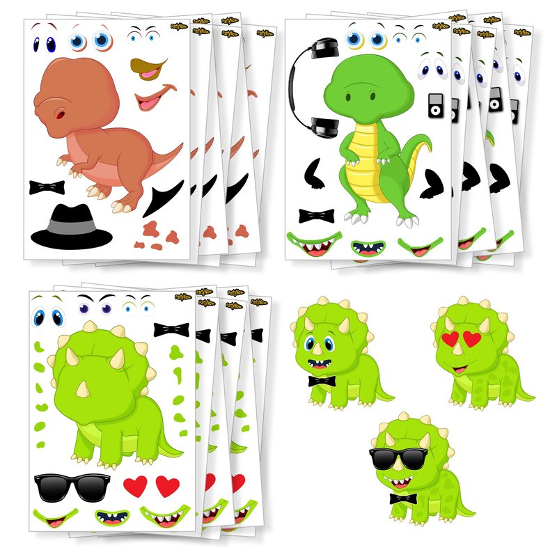 - ✔️ Cute Dinosaur Stickers: These dino stickers will take your kid into the amazing world or dinosaurs and guarantee endless moments of fun! Children have the opportunity to create silly or funny dinosaur faces by combining all the parts in a unique way!
