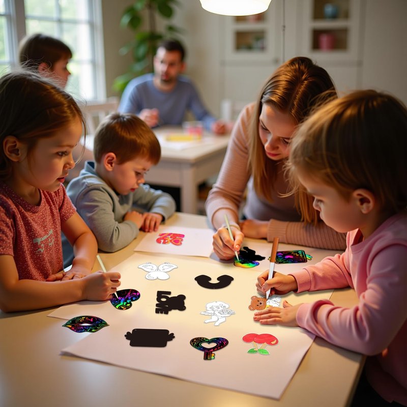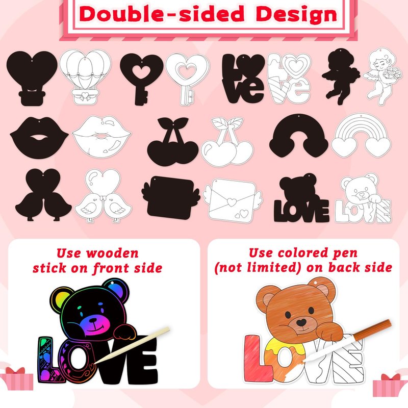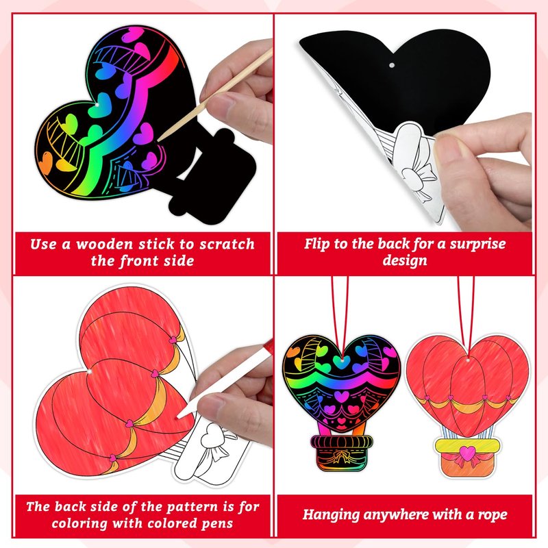 - 【Novel Painting Materials】The Valentines scratch cards are made of paperboard material. Brilliant colors and patterns are hidden under the black coating, no complicated art tools are needed, just use a wooden stylus that can scrape off the black coating to complete a magic scratch paper.