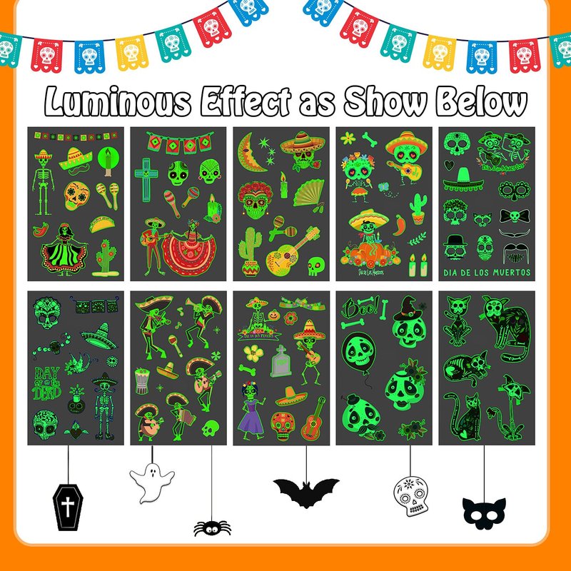 - 【Applicable Place】The temporary tattoos are suitable for Day of the Dead decorations, Mexican party favors for kids, Halloween costume, Day of the Dead makeup, etc. Are you looking for the cute glowing Day of the Dead party accessories? Our luminous temporary tattoos is your good choice, which will add the fun of party!