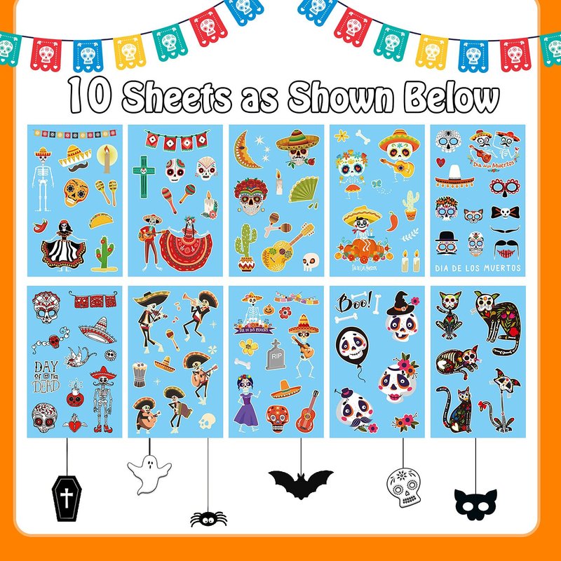 - 【Waterproof and Luminous】10 Sheets (100 Styles) in the package! Each sheet measures 4.7 " x 2.9 ". Our Day of the Dead tattoos undergo rigorous party testing, the fake tattoos will not come off easily and stay on skin 3-5 days or more.
