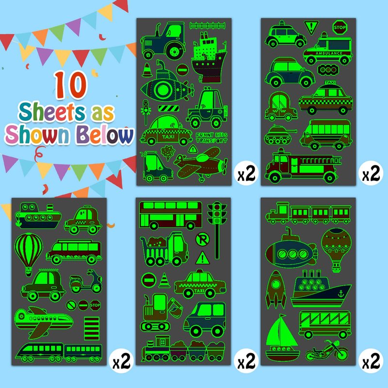 - 【Huge Hit for Kids Party】Package contain 10 sheets (about 110 Styles) luminous cars temporary tattoos for kids, this means that every kid at the party can get one or more luminous cute tattoos. Each sheet measures 4.8 " x 2.8 ". It is a suitable size suitable for children. Every kid will love these glow tattoo stickers!