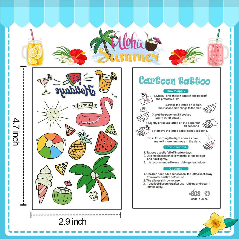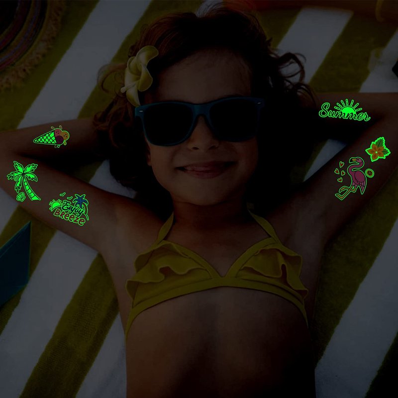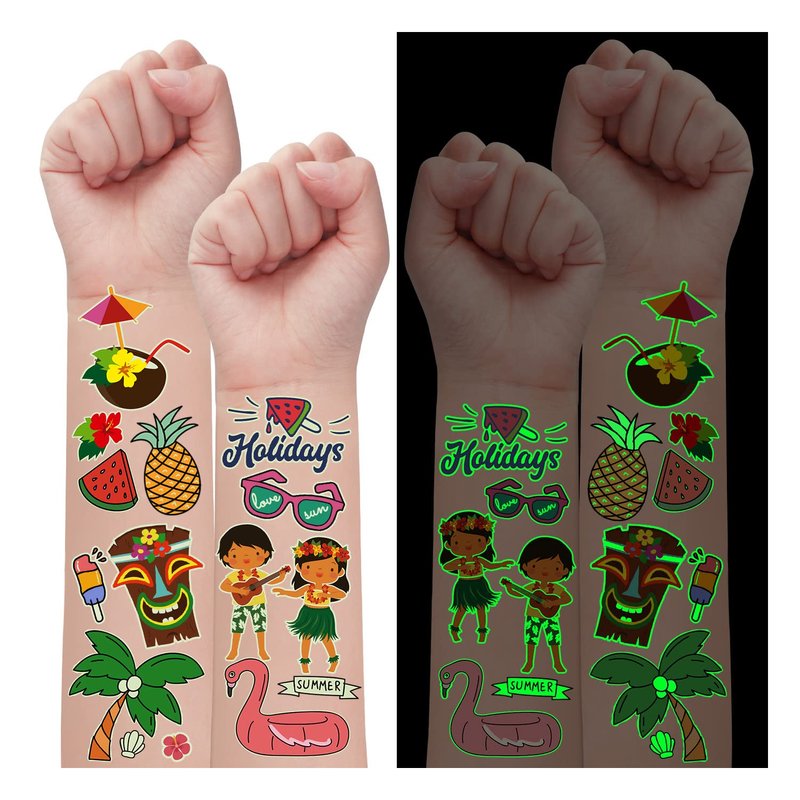 - 【Applicable Place】These glow temporary tattoos are suitable for Hawaiian/luau/tropical/pool/beach kids party supplies, birthday party decorations, party favors, gifts for kids, games. You can also apply them to your body or some smooth objects, such as glass, tile, water bottle, paper, stainless steel, plastic, gift box, mobile phone case and so on.