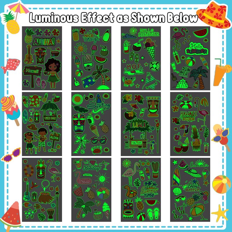 12 sheets (190 PCS) luminous Hawaiian temporary tattoos for kids toddlers boys girls.