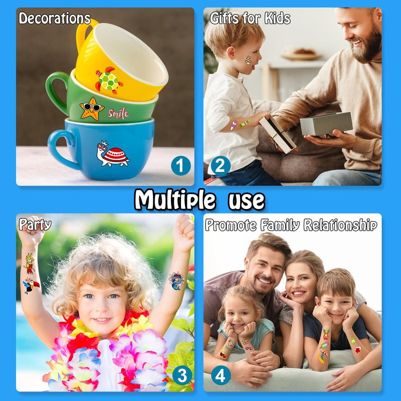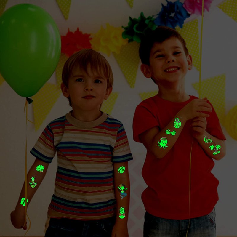 - 【Applicable Place】These glow temporary tattoos are suitable for Hawaiian/luau/tropical/pool/beach kids party supplies, birthday party decorations, party favors. You can also apply them to your body or some smooth objects, such as glass, tile, water bottle, plastic, mobile phone case and so on.