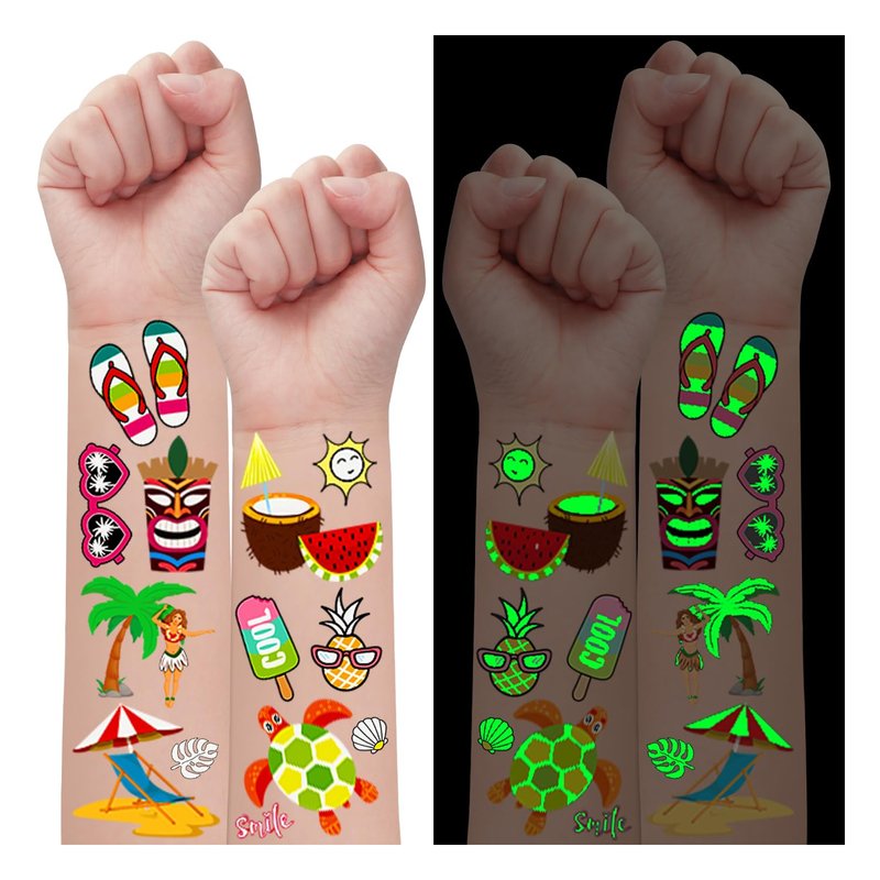 - 【Luminous Hawaiian Tattoos for Party Decorations】Super hit Hawaiian tattoos for kids party! Even at a night party with lots of people, these luminous tattoos will make you unique among the crowd! The tattoo features a cute design and various popular luau theme elements such as Pineapples, Flamingo, Hibiscus Flowers, Palm Trees that kids will like.