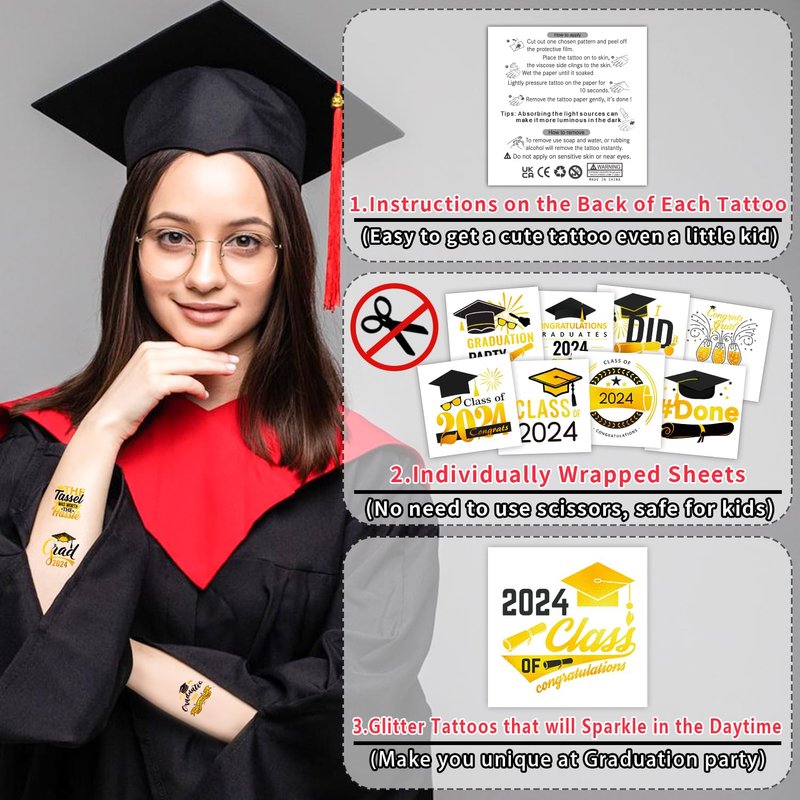 - 【Fun for Your Graduation Gathering】These tattoos stickers are suitable for Graduation party decorations, congratulations party supplies, party favors, accessories, goodie bag stuffers, games, etc. Suitable for kindergarten, middle school, high school, or college, class of 2024, etc.