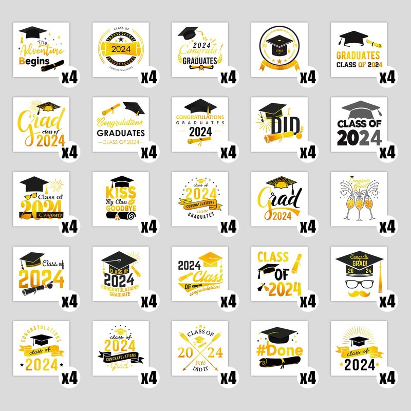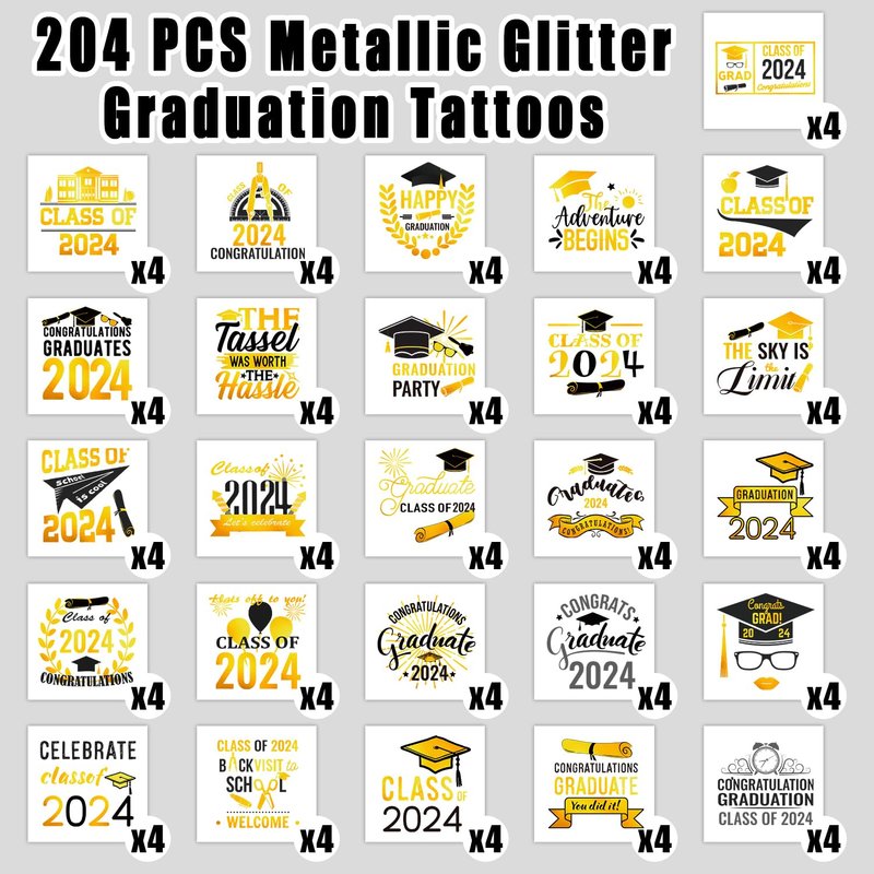 - 【Metallic Glitter Graduation Tattoos】204 Metallic Glitter tattoos designed by Partywind, incorporating the most popular graduation elements. These cute elements of our fake tattoos include Graduation Caps, Banner, Balloons, Stars, Diplomas, Class of 2024, Happy Graduation. (51 Styles*4 sheets)