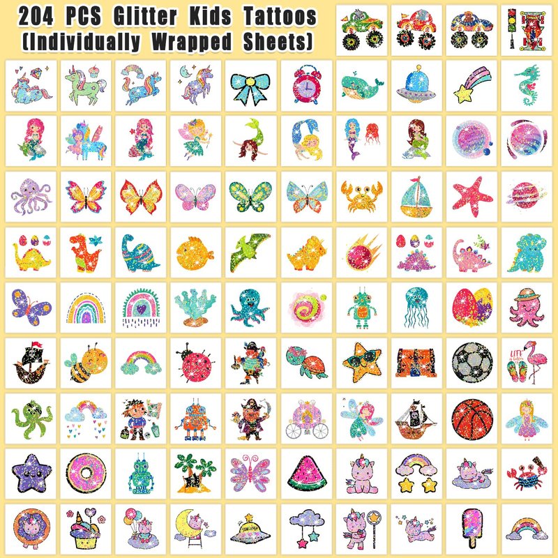 There are 204 styles glitter kids tattoos in the package! (Individually Wrapped Sheets)