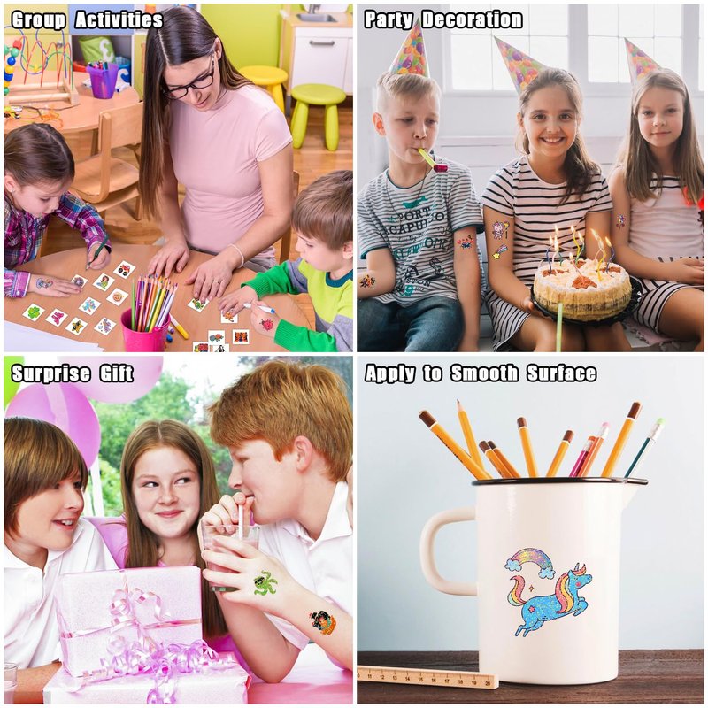 - 【Fun for Kids Party】These cute tattoo stickers will sparkle during the day and will make you unique in the crowd. Suitable for kids birthday party supplies, party favors, party decorations, goodie bag fillers, stocking stuffers, games, toys, prizes, etc.