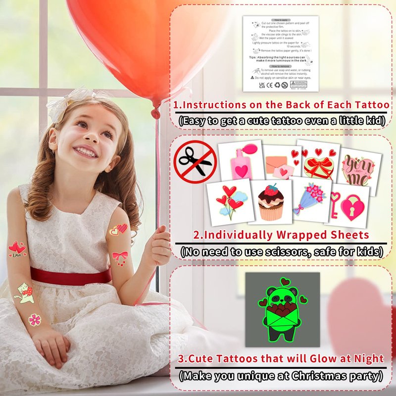 - 【Glow Valentine's Day Tattoos for Kids Party Decorations】Super glow Valentines tattoos for kids. Even at a party with lots of people, these glow tattoos will make you unique in the crowd! These cute elements of our fake tattoos include Heart, Flowers, Rose, Lips, Cake and other favorite patterns that kids will like!