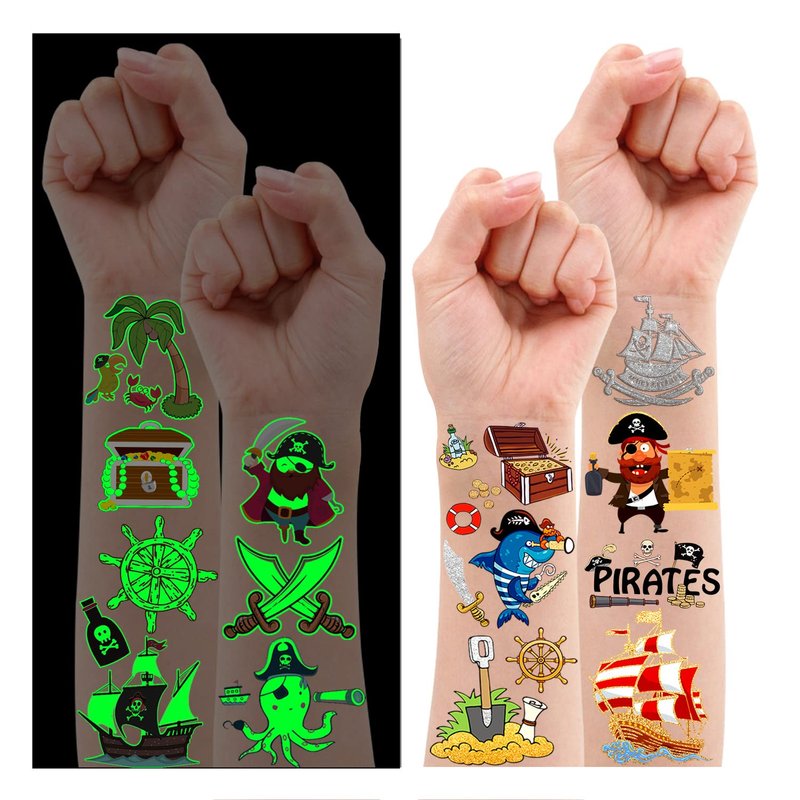 - 【Glow and Metallic Glitter Style】Mix and match of two different styles! The metallic glitter style will make you shine in the day. And the luminous style will make you unique and glow at night. A set of tattoos can make you happy all day! These super cool elements of our fake tattoos include Pirate, Pirate ship, Gold Coin, Map, Treasure Box, Mermaid and other favorite patterns that pirate fans will like!