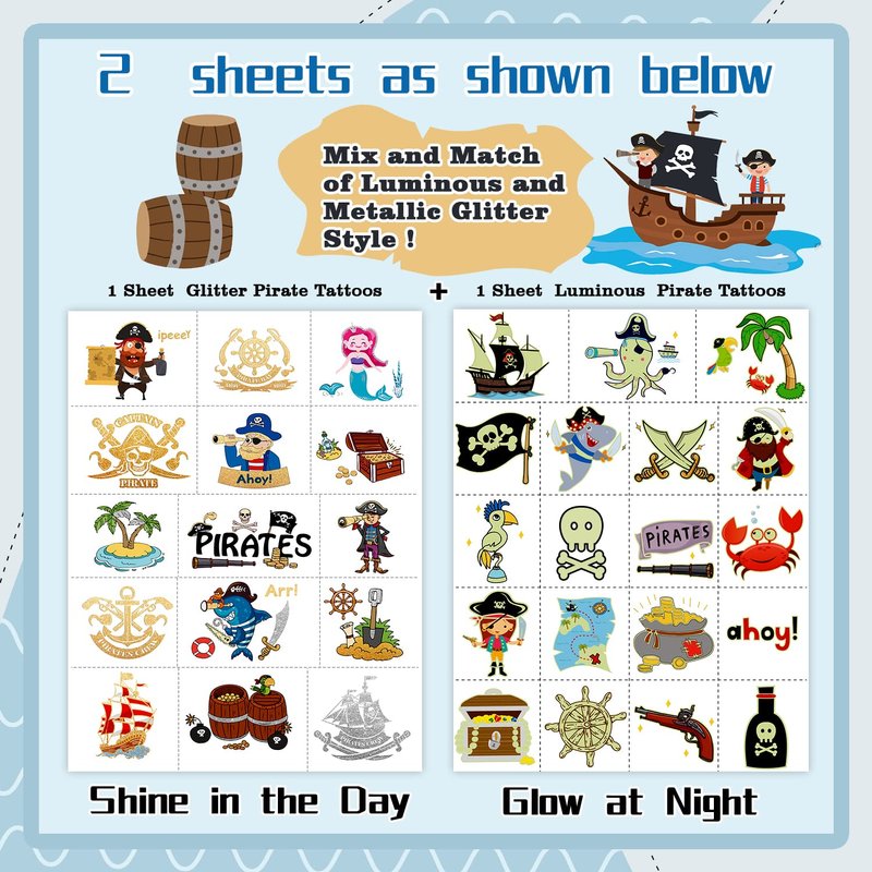 - 【Waterproof and Long-lasting】Package contain 2 different sheets (in total 34 PCS) pirate temporary tattoos for kids, this means that every kid at the party can get a cute tattoo. 1 Sheet is luminous tattoos and the other sheet is metallic glitter tattoos. Each sheet measures 8.25 " x 6 ". Our temp tattoos undergo rigorous party testing, the fake tattoos will last all day.