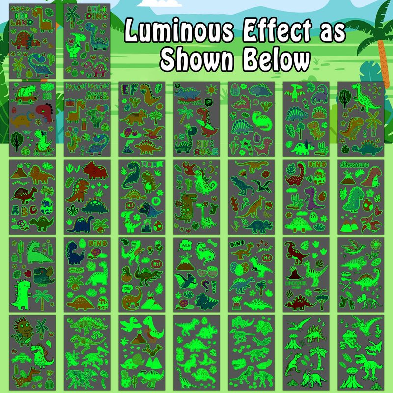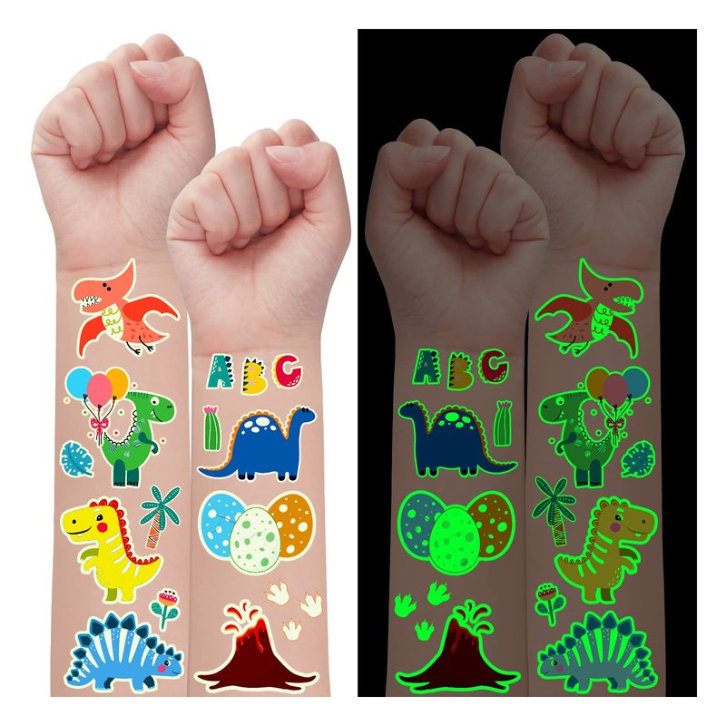 - 【350 Styles Luminous Dinosaur Tattoos】Popular luminous dinosaur temporary tattoos for kids. Even at a party with lots of friends, these glow tattoos will make you unique in the crowd! These super fun elements of our fake tattoos include various cartoon dinosaurs, volcanoes, footprints and other cute patterns that kids will like.